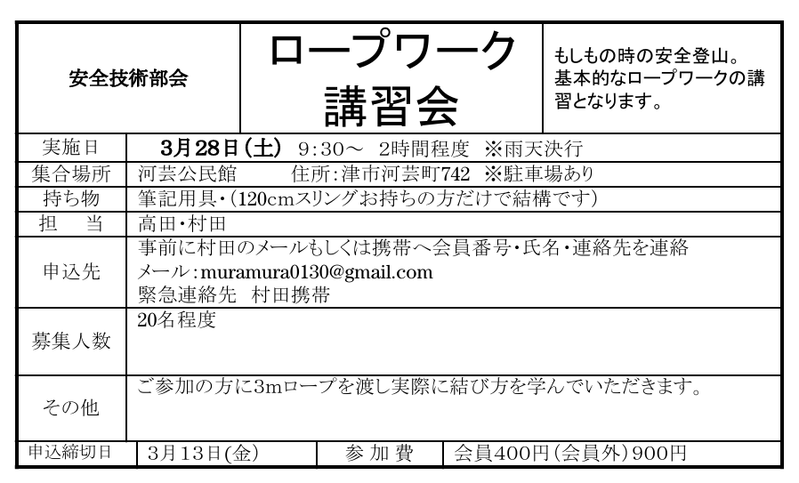◆ロープワーク講習会が2026年3月28日(土)に開催されます。