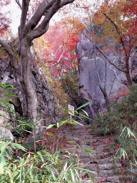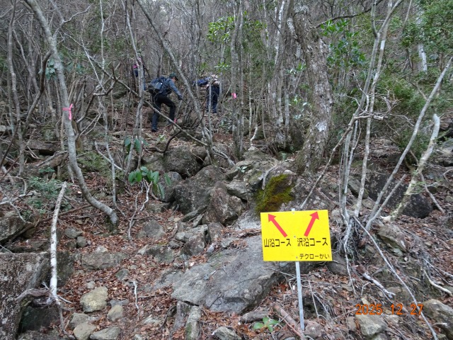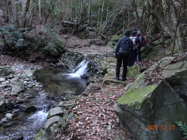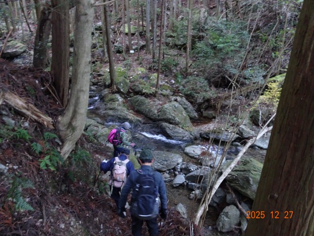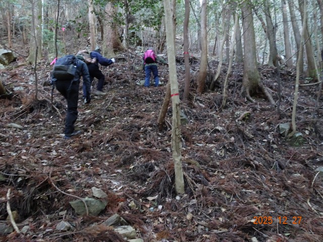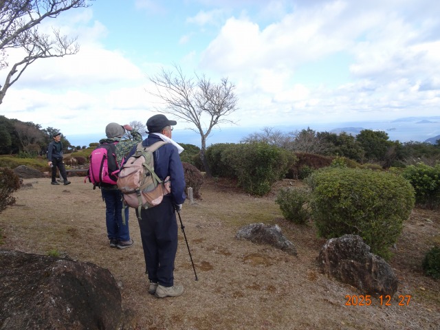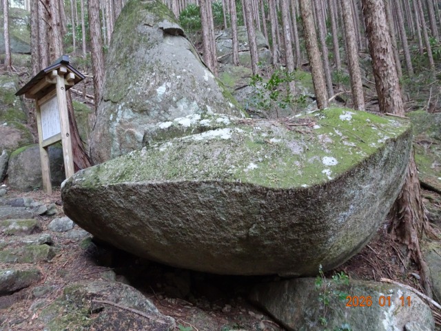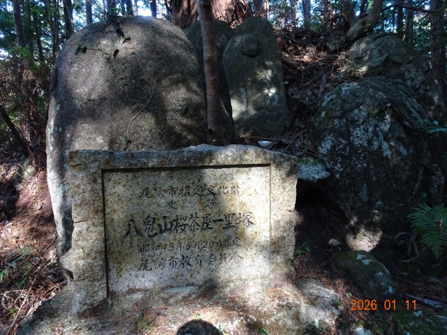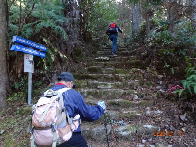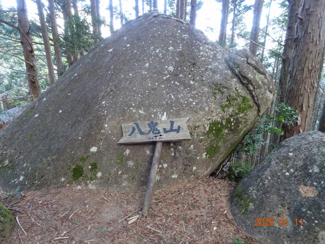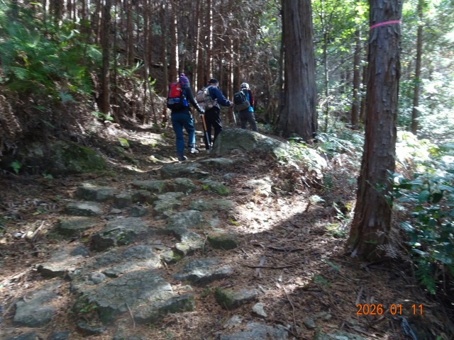1月11日に奥田・宇仁・近藤・岡本で八鬼山の下見に行きました。当日は天気はいいものの寒波で風が強く下山時には雪がちらつく寒い日でした。例会は好天で穏やかな日を願っています。 八鬼山駐車地を出るとすぐ登山口です。真砂川沿いのなだらかな道を歩いて行くとやがて石畳道になります。ヒノキ林の中を徐々に高度をあげながら進むと約1時間で林道出合があり、本格的な登りになります。町石地蔵、道標、案内板などを見ながら林の中を前へ、石畳は続きます。石畳の石一つを運ぶのも大変なのによくこれだけの石を敷き詰めたと先人の労苦に感心します。道端には大きな珍しい岩があり、これを見るのも楽しみです。 難所の七曲りを過ぎ桜茶屋一里塚、九木峠を過ぎるすぐ頂上です。見晴らしはありません。さらに少し歩くとさくらの森エリアで、広い芝生広場に着きます。登りは約3時間で昼食休憩です。熊野灘が眺望できます。よーでる会3月例会の頂山が真正面に見えます。 食後はもと来た道を戻りますが、石畳の下りは滑りやすいので慎重に下ります。登山口駐車場には往復約5時間35分で着きます。史跡の多い古道のハイライトコースを、今回は高齢者でも登れるように安全を確保しながらゆっくり登ります。皆さんのご参加を待っています。