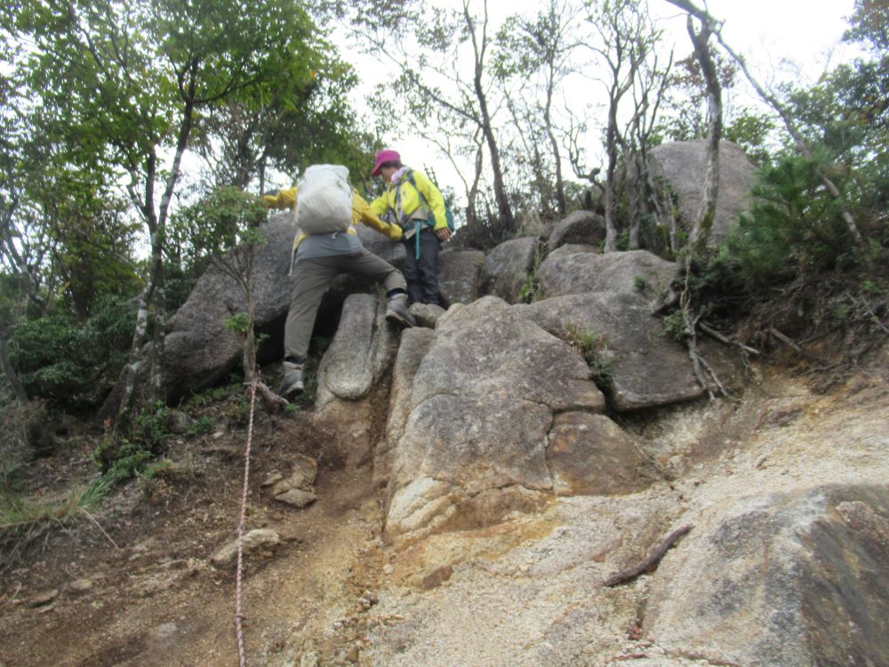 11月12日開催予定の「天狗倉山例会」の下見を10月1日に実施しました。計画では、海山道の駅⇒馬越峠⇒天狗倉山⇒オチョボ岩⇒水地越⇒小山浦狼煙場⇒猪ノ鼻⇒海山道の駅の周回コースでしたが、10qを超えるロングコースでアップダウン、危険個所も多いこと、エスケープルート2個所を確認したところ、いずれも途中で通行困難となることが確認されましたので今回は天狗倉山の往復コースとすることにしました。