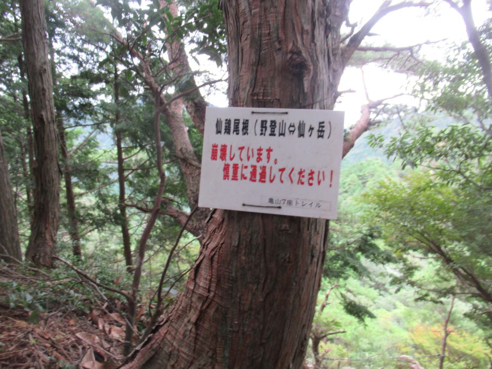 10月6日ジョイント例会の下見を実施いたしました。天候は、小雨を心配しましたが、曇り空で涼しく、ロングながら、気持ちよく歩けました。久しぶりに鈴鹿の山を歩いてみて、登山道が崩れて、危険な場所が沢山あるのに、びっくりしました。当日のコースの変更をせざるを得ませんでした。一の沢から⇒野登山⇒仙鶏尾根⇒仙ヶ岳のコースは、まず、渡渉で水が多いことが予想されます。また、仙鶏尾根から仙ヶ岳は、崩落の為危険と看板もあり、大きな岩が崩れ落ちていました。ロープの箇所も何箇所かあり、大人数でこの道を歩くのは危ないと判断しました。