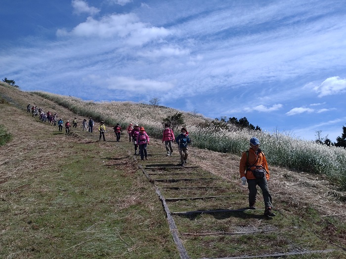 誰でも登れる曽爾高原、お亀池散策例会は青空の下すすきが、銀色に