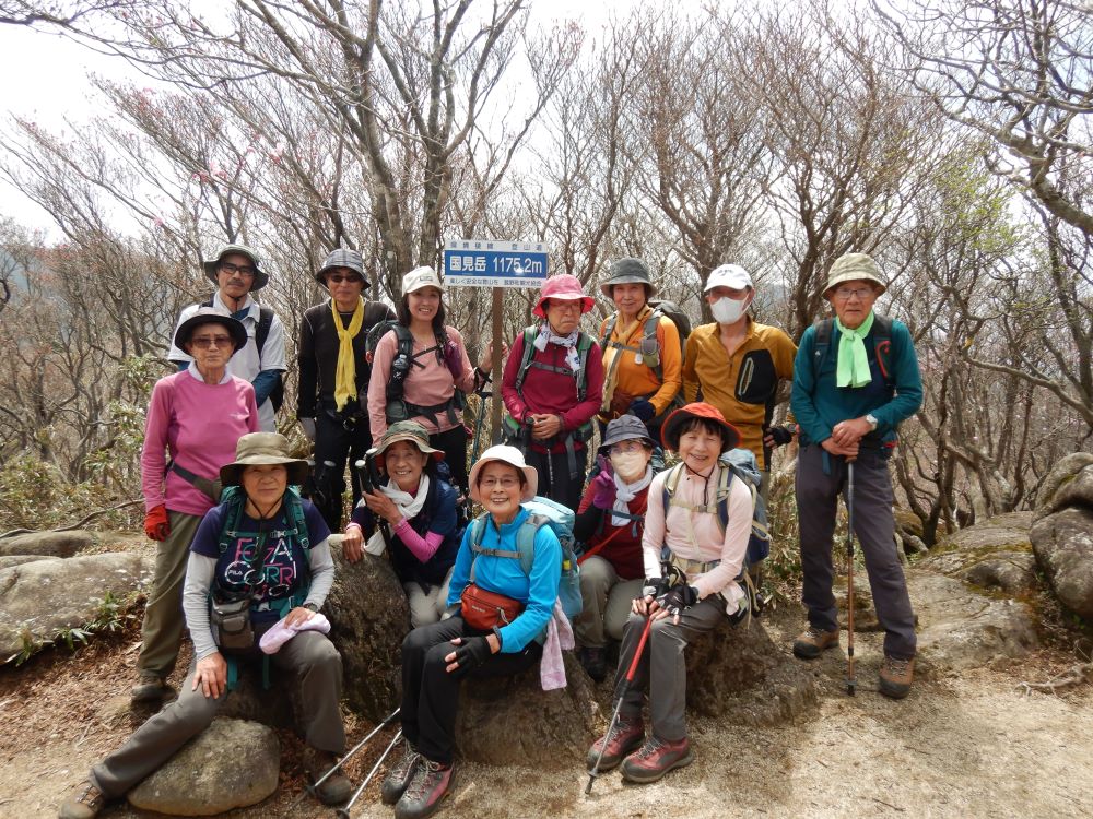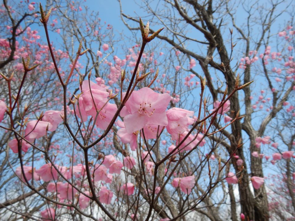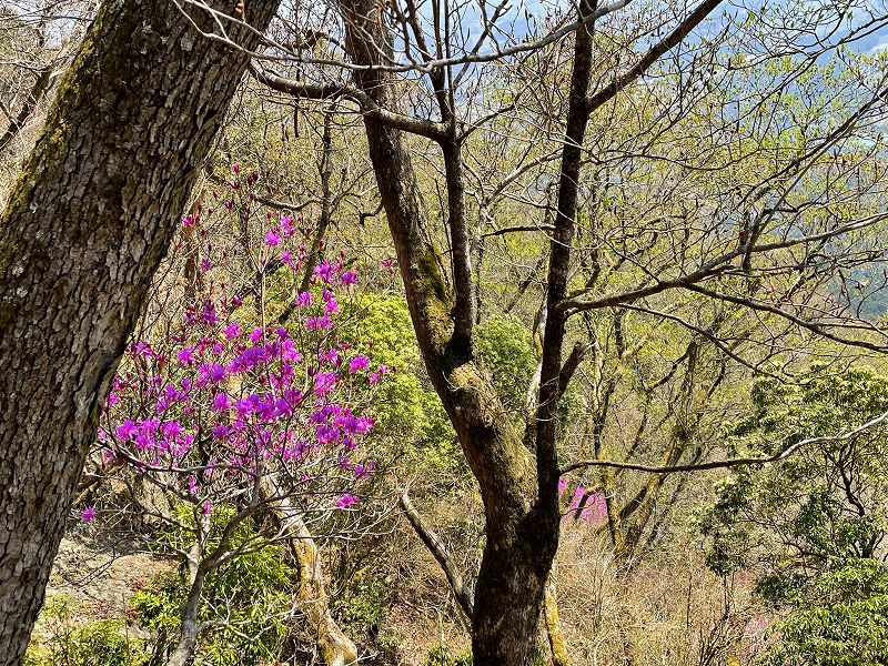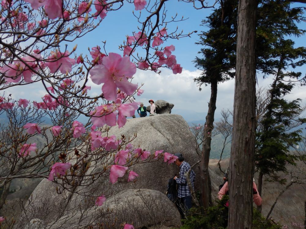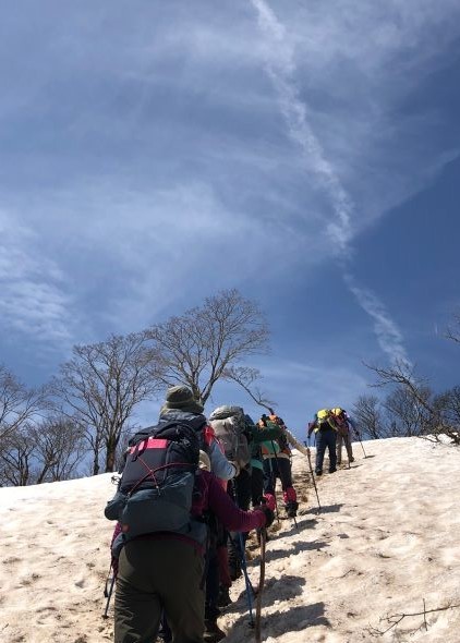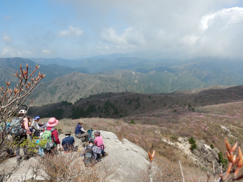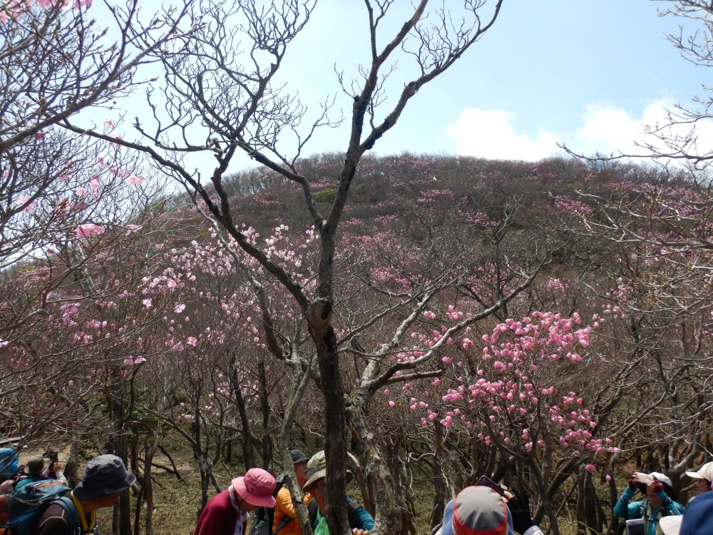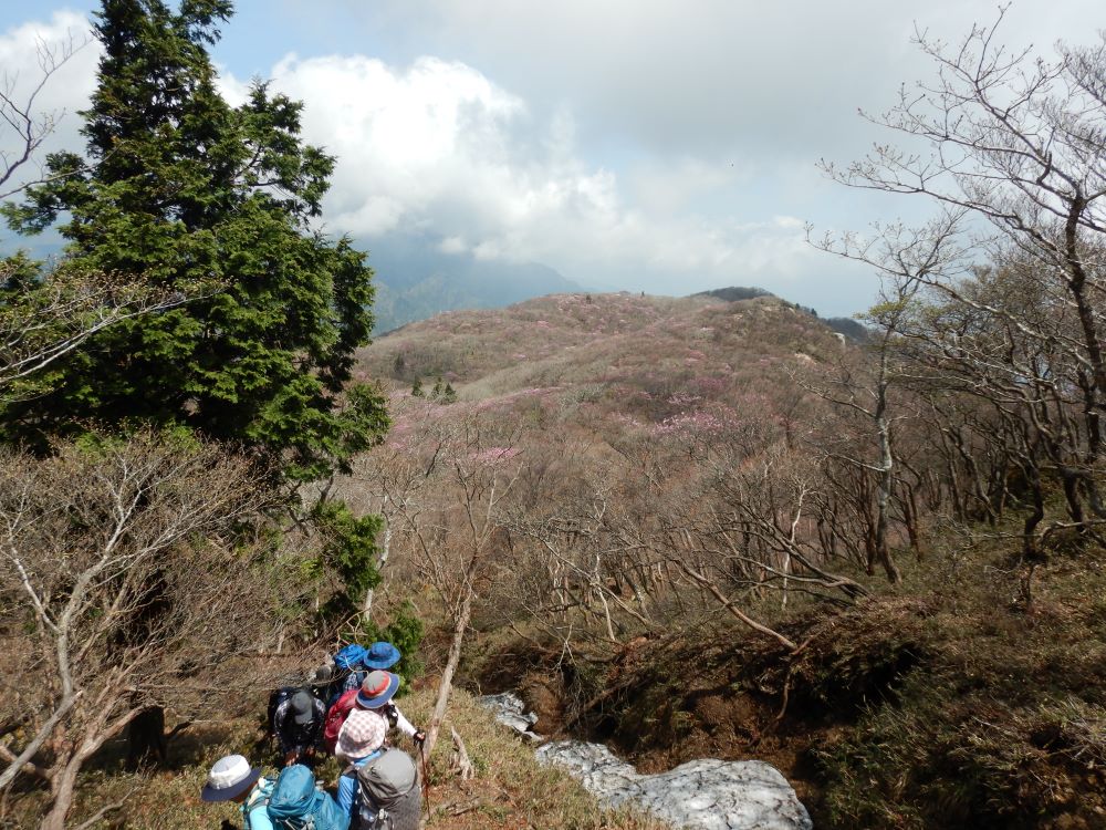 25日の天気、直前まで曇りと心配しましたが幸運にも快晴となりました。参加者26名でストレッチを済ませ目標のハライドのアカヤシオを期待して登山開始をしました。しかし、ハライドの頂上付近でも、はとんどのアカヤシオは散ってしまっていてがっかりしました。 ハライドからの急斜面の下りとヤシオ尾根への登りはかなりキツかったですが三点支持で慎重に下り、登りをしました。ヤシオ尾根では、所々にアカヤシオが咲いてました。 県境尾根に入った所で思わず目を見張りました。満開のアカヤシオが私たちを迎えてくれました。青空の中周り一体にアカヤシオ。国見岳の山の斜面一面にアカヤシオ。太陽にアカヤシオの花びらが輝き、山全体をピンク色に染めてました。諦めかけていた満開のアカヤシオを堪能し大満足でした。 その後国見岳で昼食を済ませ、キノコ岩、ブナ清水を経て無事下山しました。 下山後の感想は一ヶ月前の下見では山一面が冬景色で1,000M以上は雪に覆われてました。わずか一ヶ月後には春景色でアカヤシオや春リンドウが咲き誇り、日本の四季の素晴らしさを実感しました。また、8キロメートル、登り下りの標高差900M弱 、行動時間7時間を26名の参加者の方、元気に歩いていただき感謝しております。本当にありがとうございました。 |